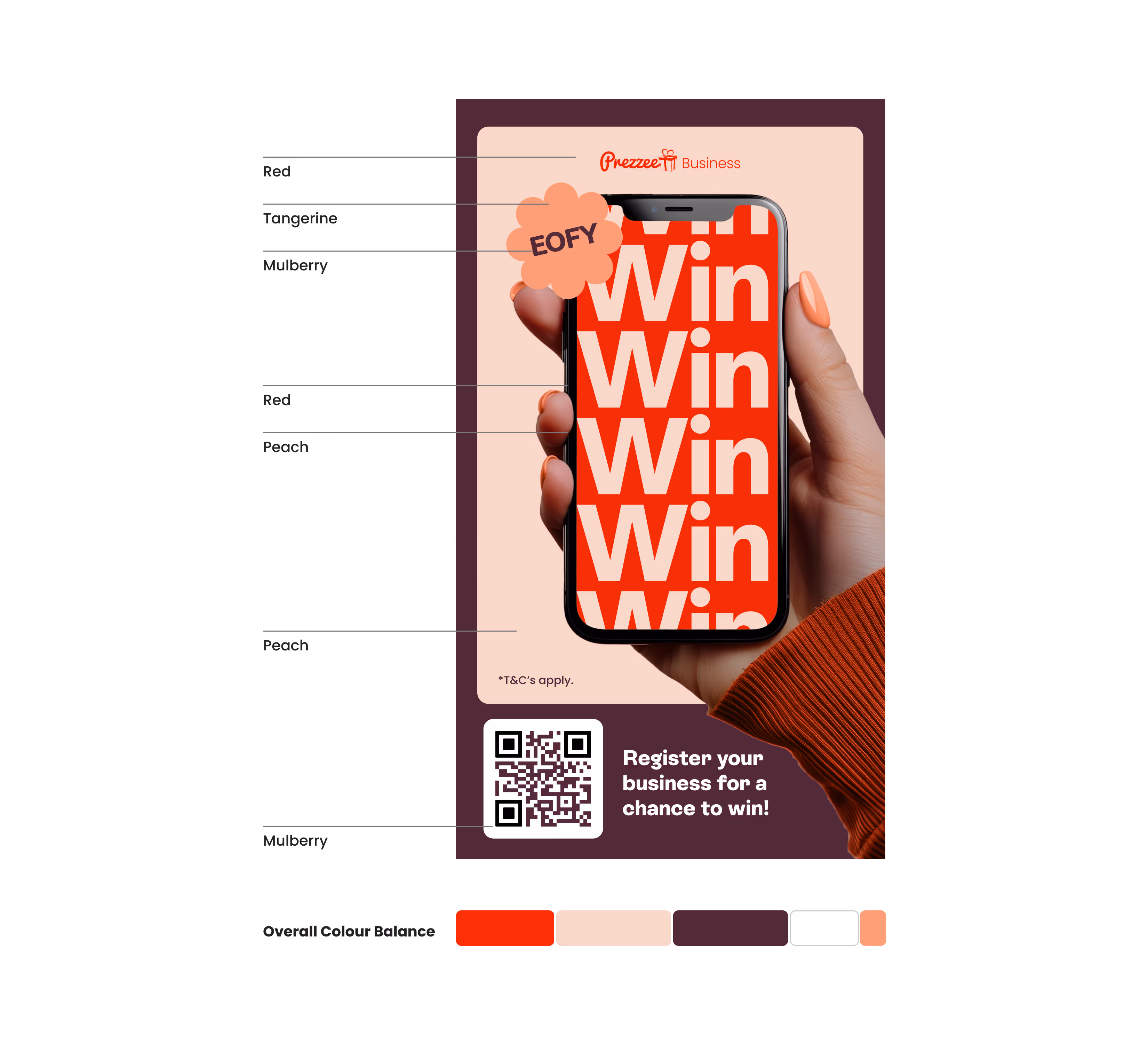 To avoid overwhelming the design, balance Prezzee red with use of supporting colours from the secondary and tertiary palettes. Think of red as the lead in the story, not the whole script.
